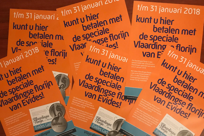 De ‘Vlaardingse Evides Florijn’ wordt geschonken door Evides Waterbedrijf aan de Vlaardingse huishoudens. Het is een betaalmiddel dat uitsluitend in Vlaardingen gebruikt kan worden t/m 31 januari 2018. Met de ‘Vlaardingse Evides Florijn’ heeft u een echt betaalmiddel in handen dat overal in onze historische vissersstad besteed kan worden bij elke winkel of horecabedrijf waar de poster hangt.